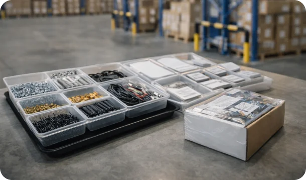 Kitting is a logistics and warehouse process in which individual components or parts are picked, grouped, and packaged together as a single, ready-to-use unit (kit) for assembly, production, or distribution. Kitting streamlines operations by reducing handling time, minimizing errors, and ensuring the right materials are delivered together, in the correct quantity and sequence.